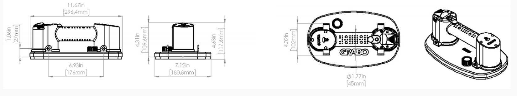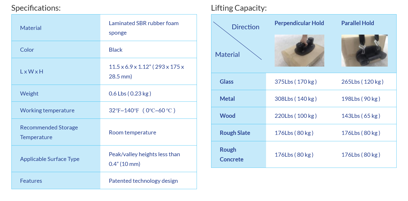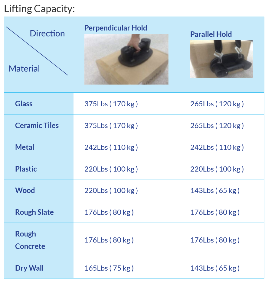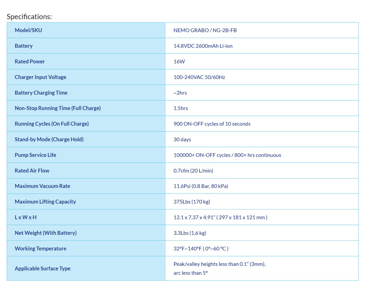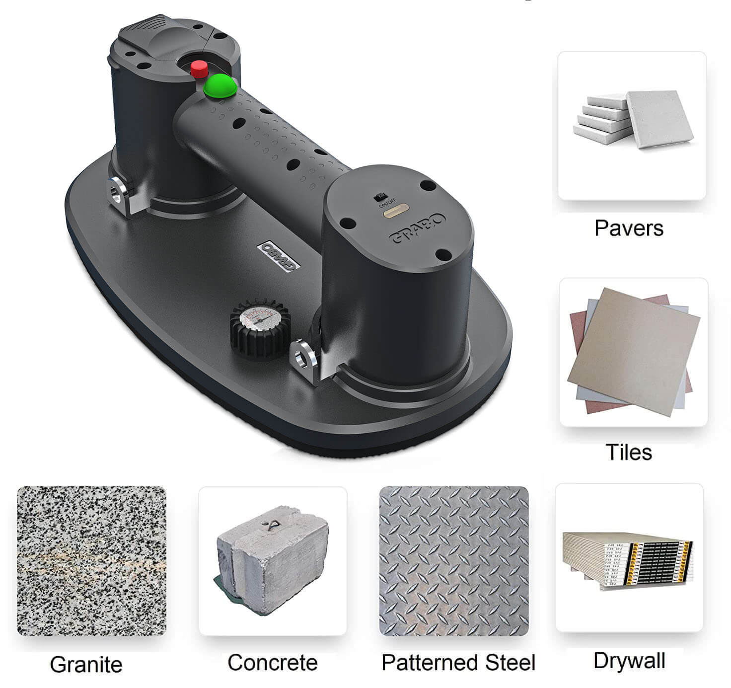 The Nemo GRABO Classic is an ideal lifting tool for countertops, doors, panels, etc. The tool works perfectly with glass, wood, ceramic tiles, metals, and other materials. The tool works at a maximum vacuum capacity of 11.6 psi, with an optimum lifting capability of loads as heavy as 375 lbs or 170 kgs.